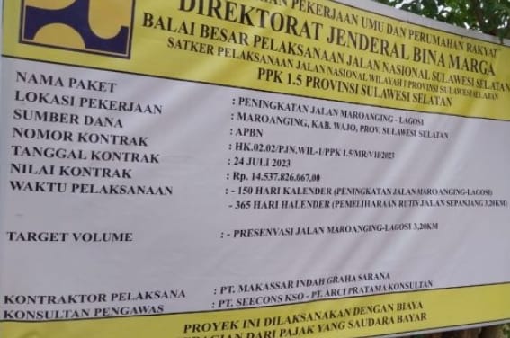 Proyek Pembangunan Peningkatan jalan sepanjang 3,200 meter dengan menggunakan Anggaran Pendapatan Belanja Negara sebesar Rp. 14 Milyar lebih (Rp.14.537.826.067.00) APBN 2023 di kerjakan oleh PT Makassar Indah Graha Sarana dengan konsultan pengawas PT SEECONS KSO – PT ARCI PRATAMA CONSULTAN diduga tidak sesuai Bestek