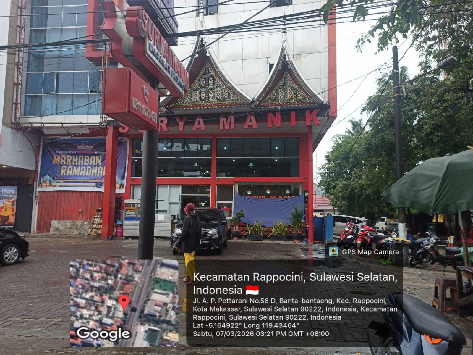 Kondisi geografis lokasi ini di Jl. A. P. Pettarani, dengan fasad bangunan berwarna merah khas Sulawesi dan ornamen yang menonjol, menambah kesan menarik dan padatnya aktivitas di sekitar. Beberapa kendaraan tampak parkir di depan warung, disertai payung hijau dan spanduk bertuliskan “MARHABAN RAMADHAN”, mengindikasikan suasana bulan puasa.